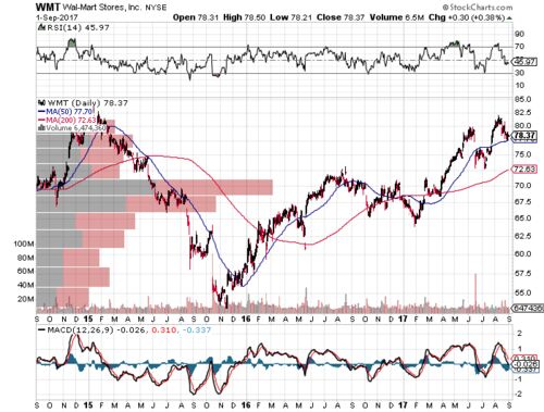 ウォルマート(WMT)2017Q1決算 ・決算発表日 2016/5/19 プレマーケット・売上は$116Bでコンセンサス予想より+$2.68B・EPSは$0.98でコンセンサス予想より+$0.10・決算発表後の株価はプレマーケットで+7.46%で推移・2017Q2の予想EPSは$0.95〜1.08